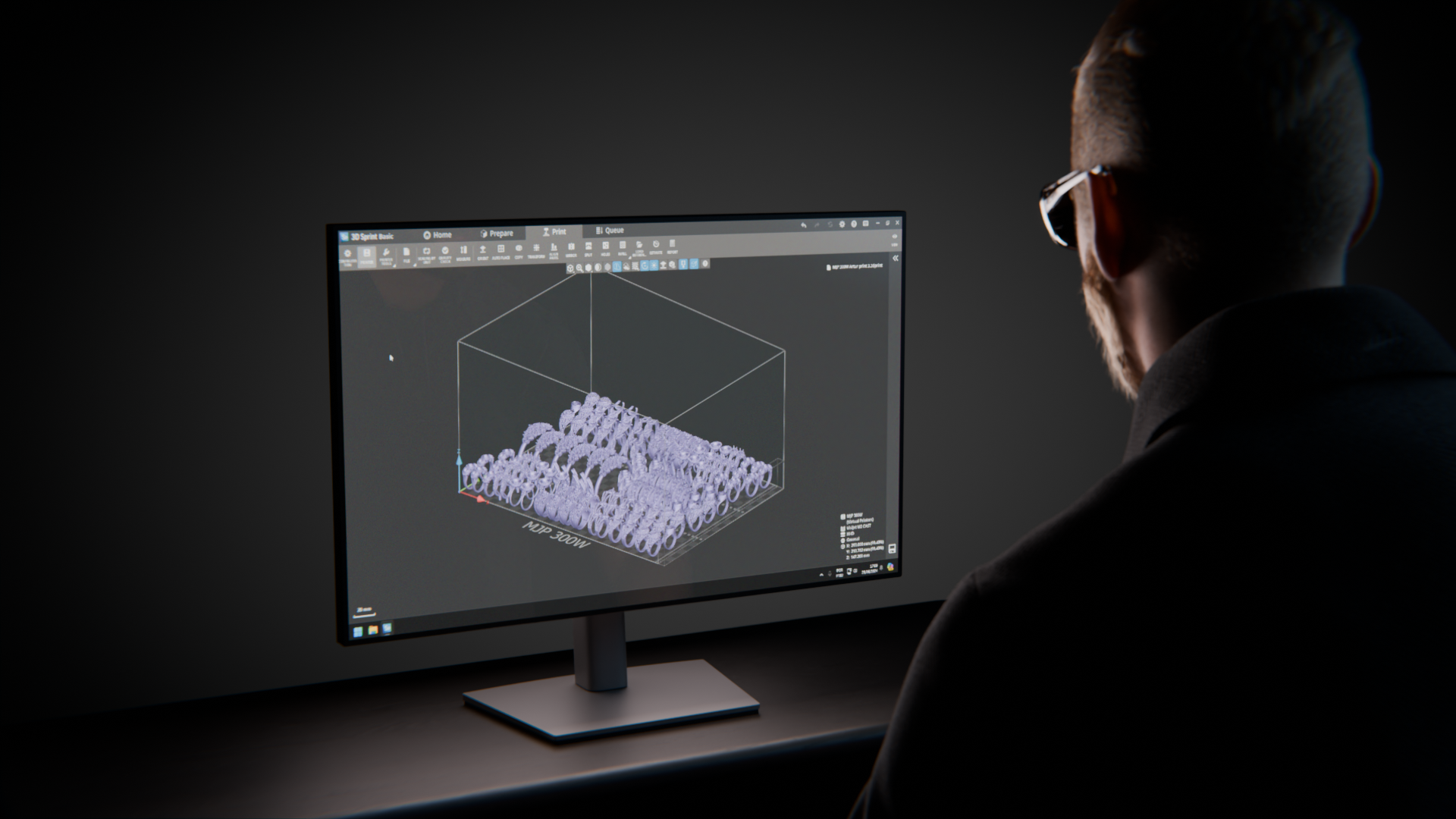 Cinematic 3D animation of MJP 300W with fluid & particle sim, procedural print & supports, and advanced PBR shading for jewelry casting.