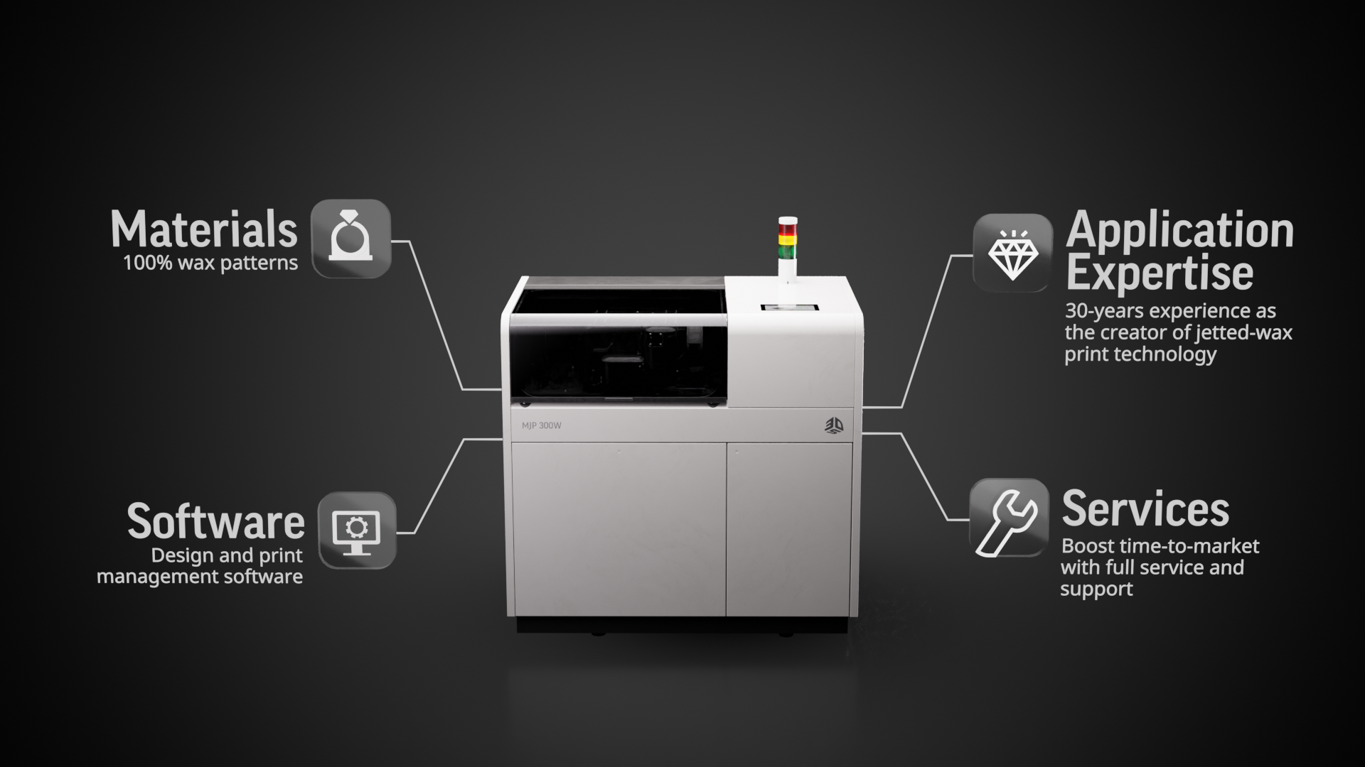 The MJP 300W is a high-resolution wax 3D printer designed to produce 100% wax patterns for traditional lost-wax casting — enabling jewelers to create intricate pieces with excellent repeatability and surface quality.