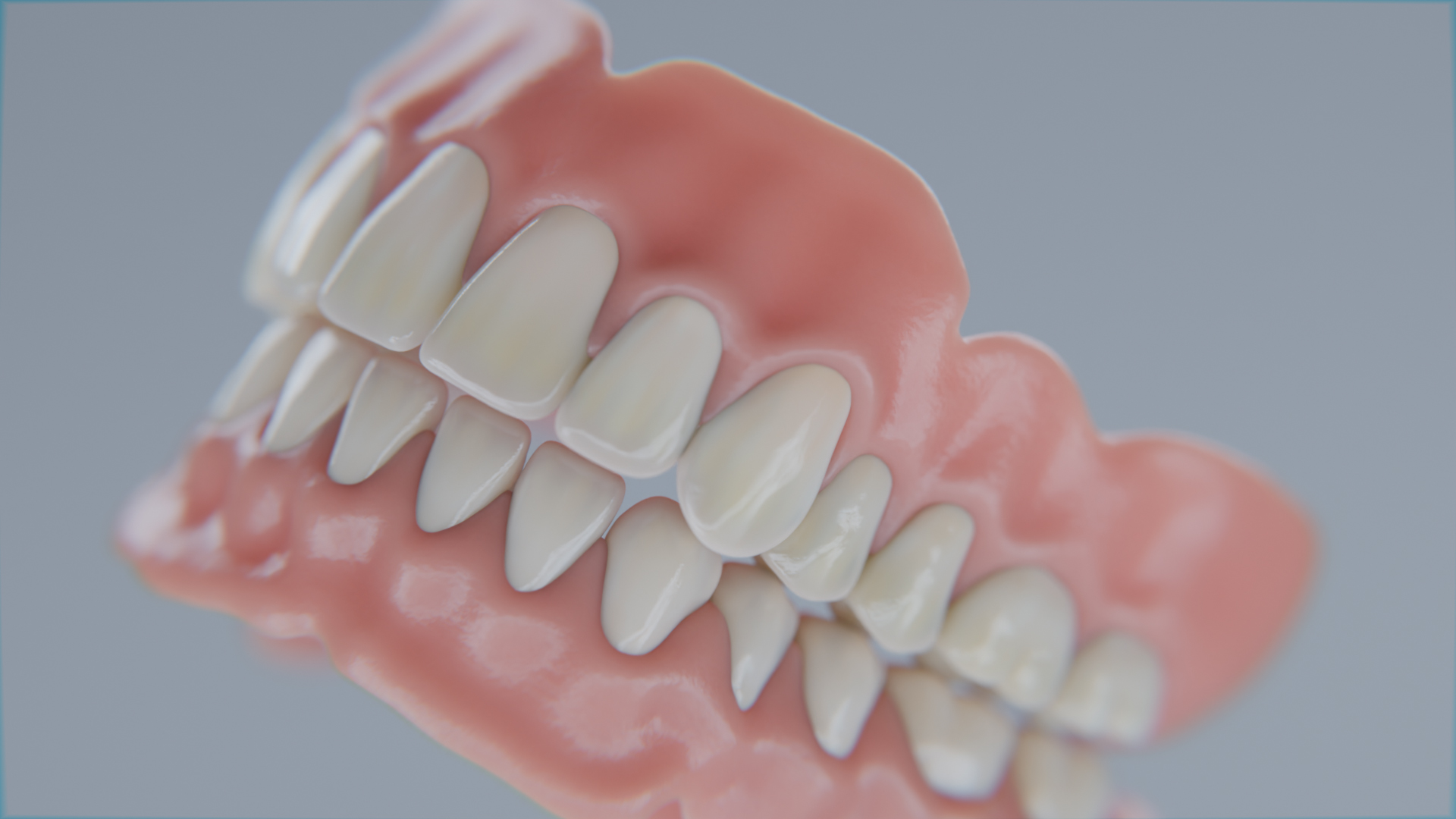 - Careful shader calibration to represent the complex interaction between tooth enamel and gum materials — achieving natural translucency and light behavior